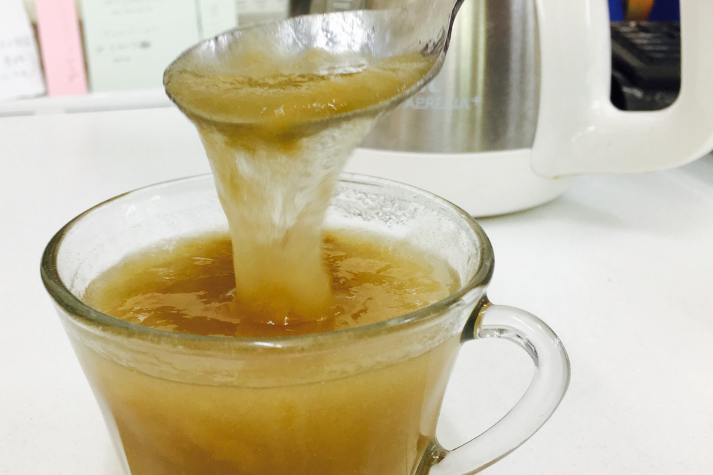 美麗綺は水やぬるま湯とともに飲むと、身体の中でドロっと固まります。これは2本の美麗綺をぬるま湯で溶かしたときの映像です。美麗綺でスッキリこのようにドロドロに変化することで不要なものをしっかりと吸着。翌朝のスッキリをサポートします。